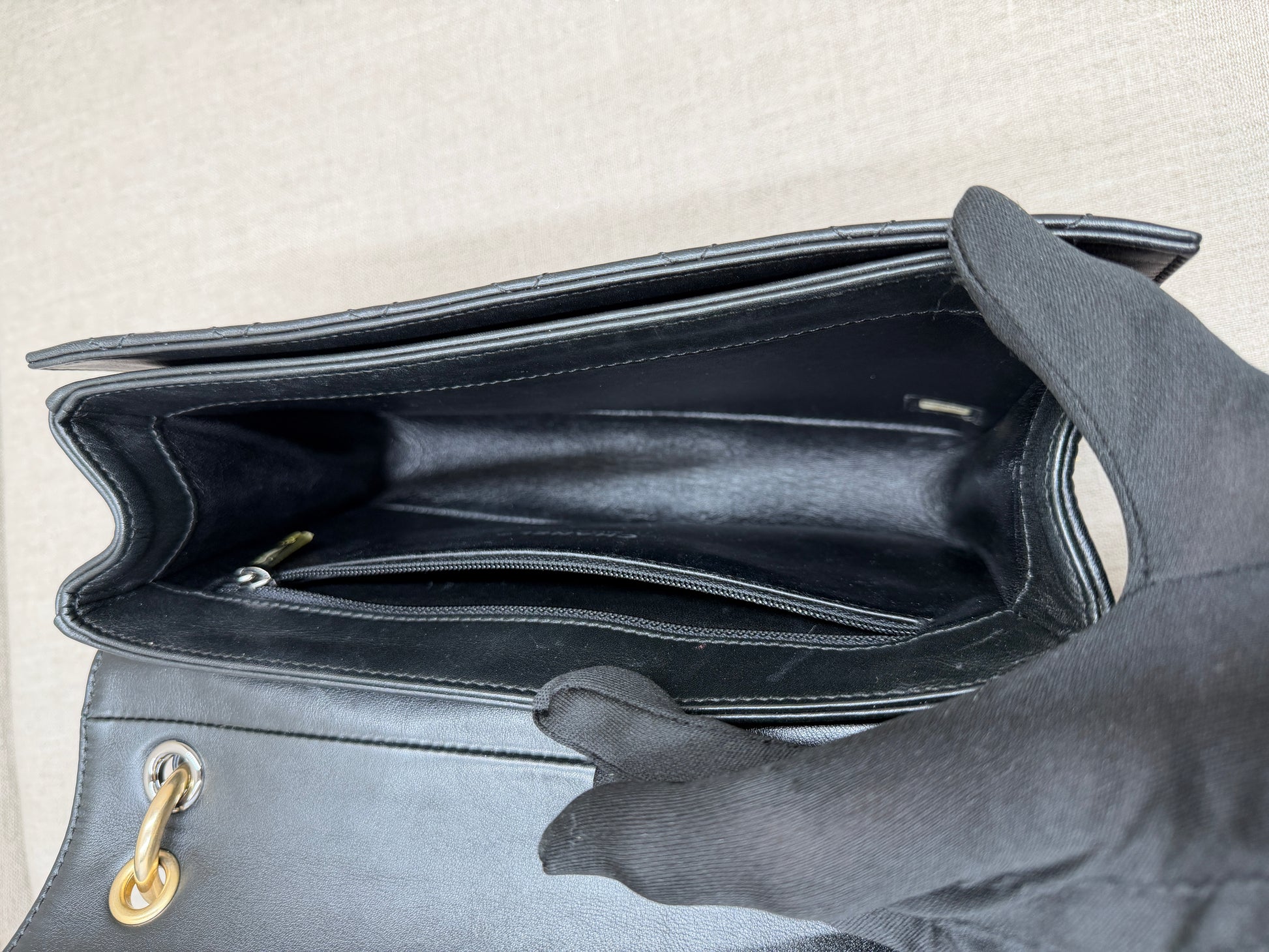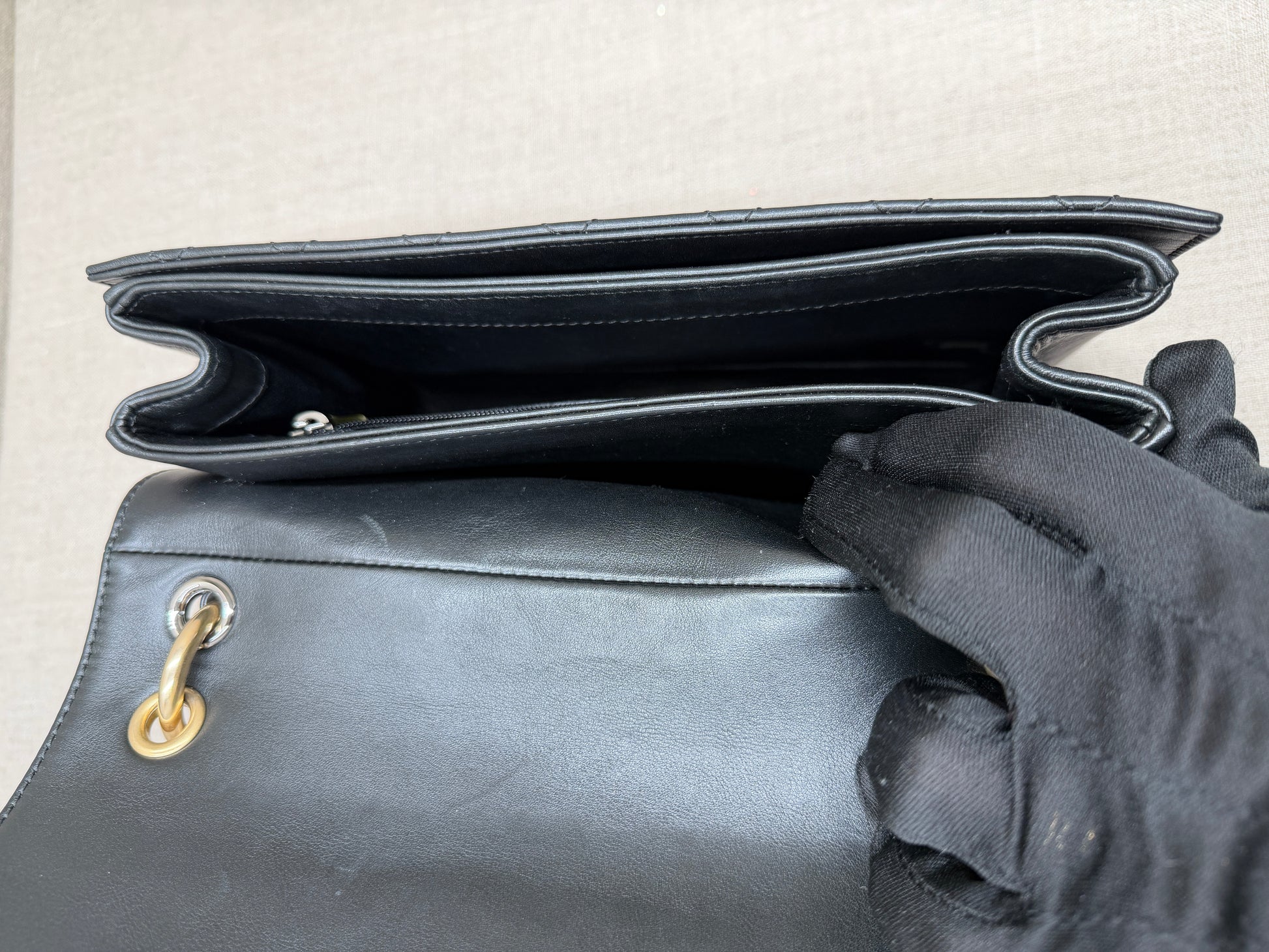 Svart innerfoder, detaljer i 24K guldpläterad metall, insidan med ett stort fack, två mindre och ett litet med dragkedja.