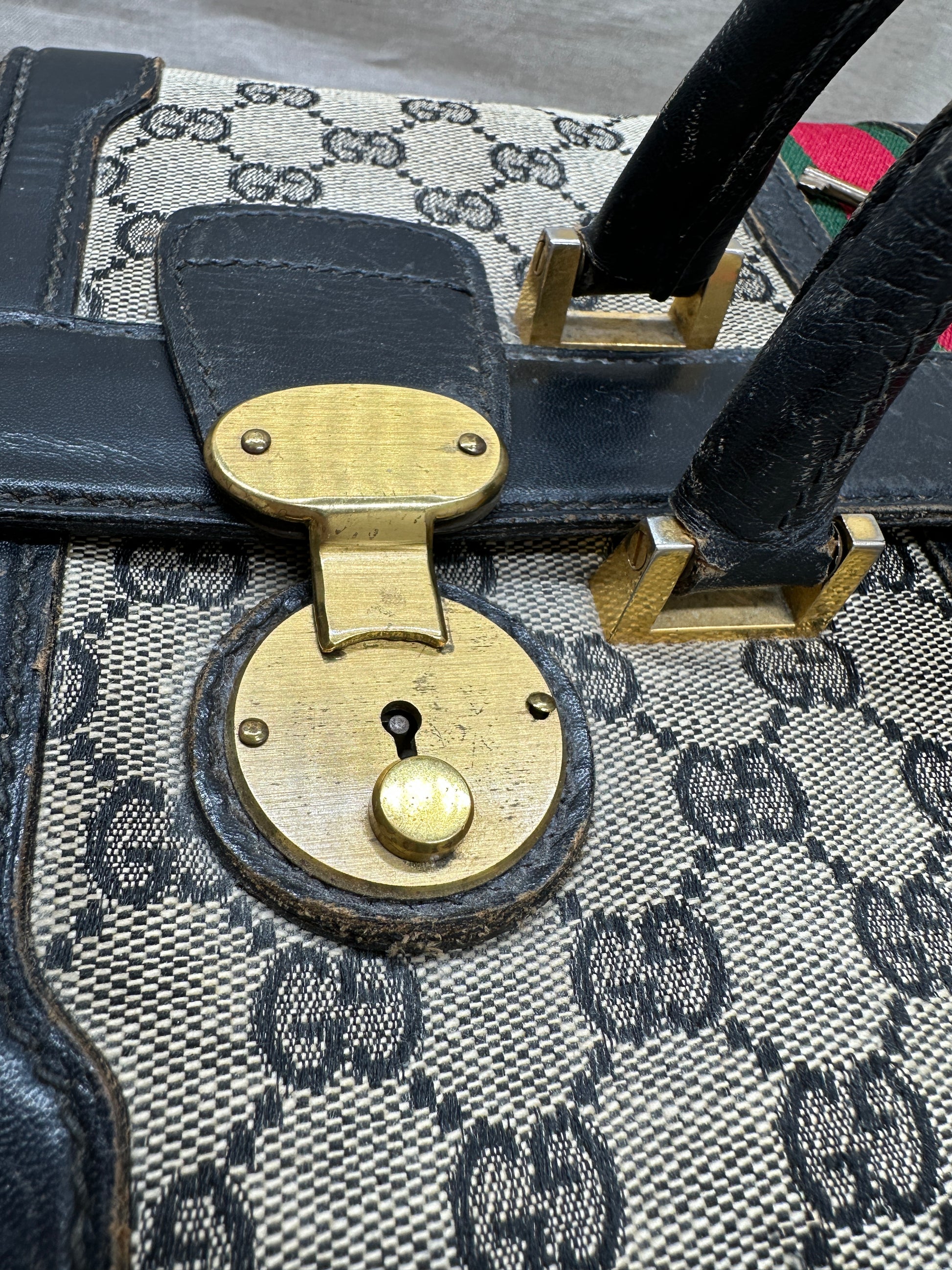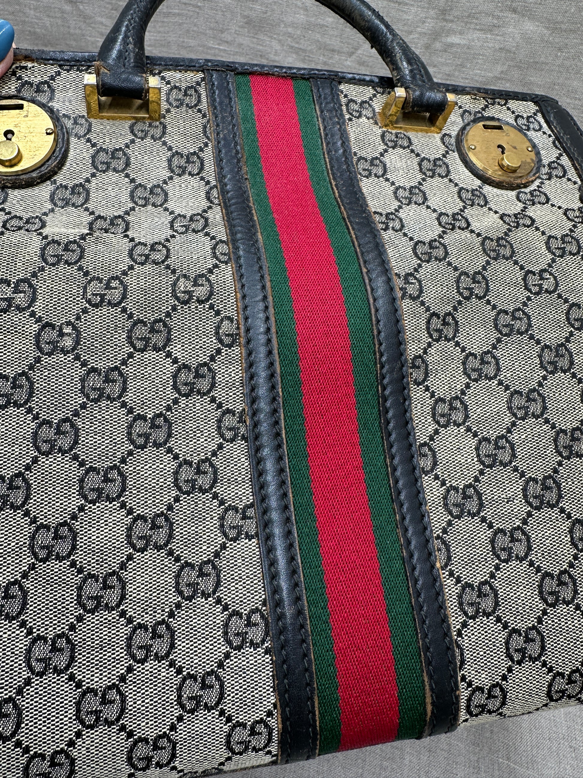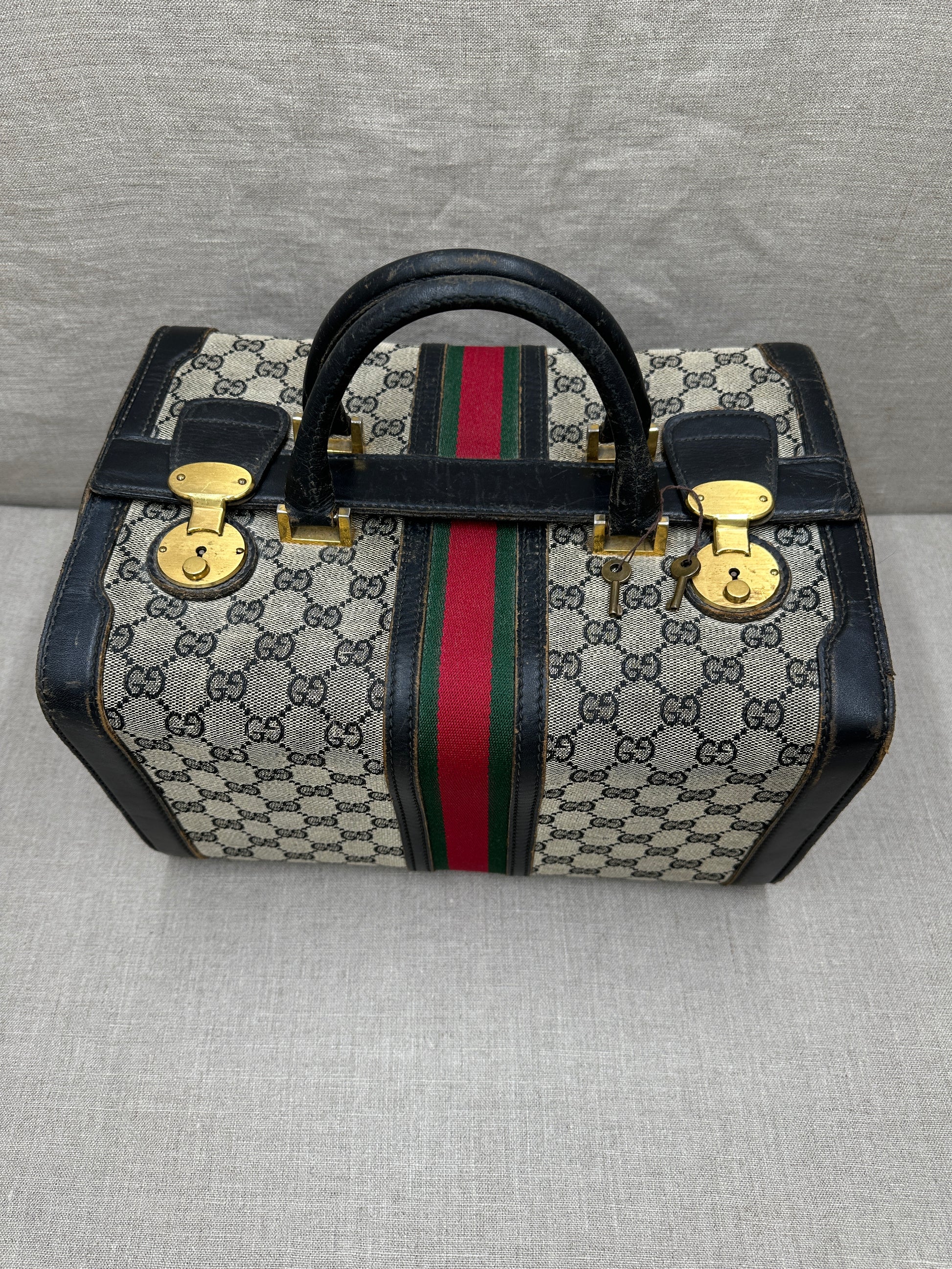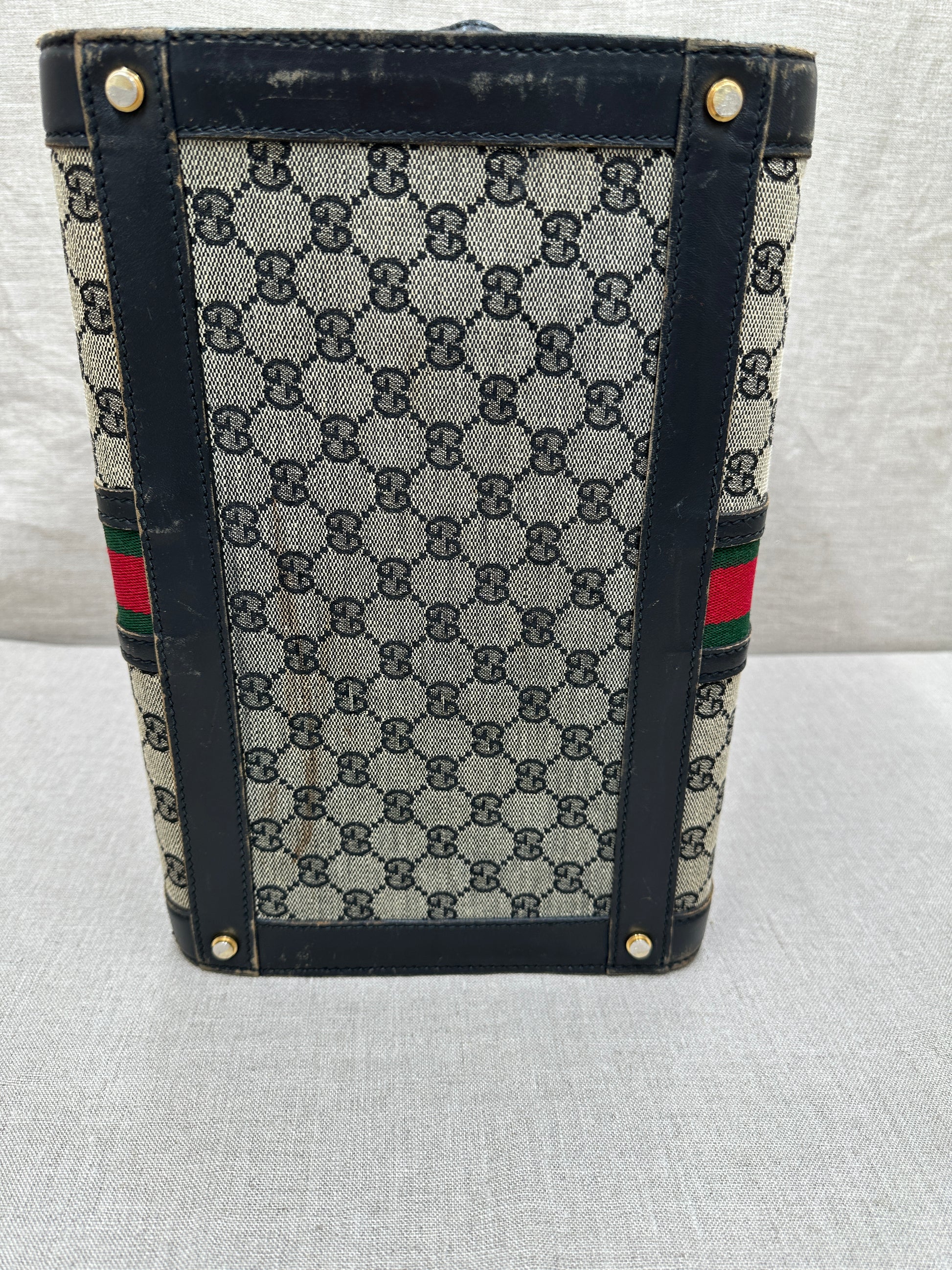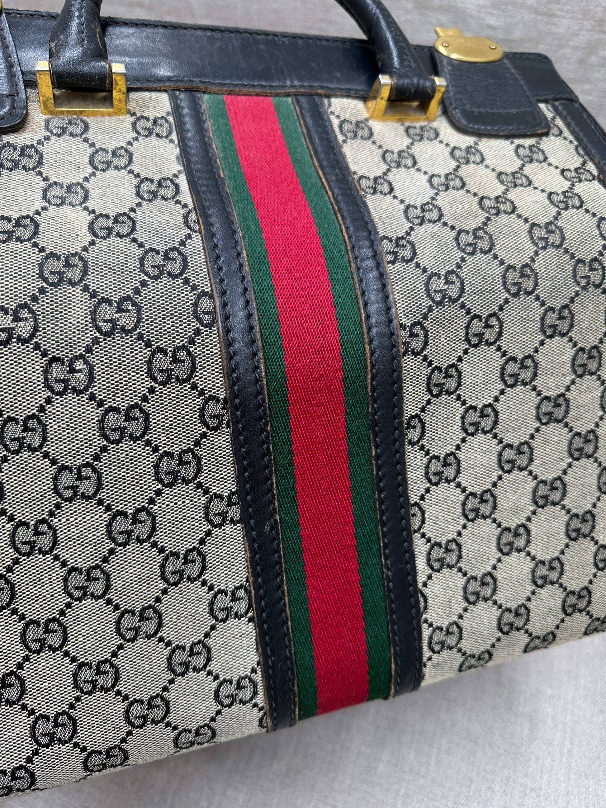 GG supreme canvas samt mörkblått skinn. Röd/grön revär. Guldfärgad metall detaljer.
