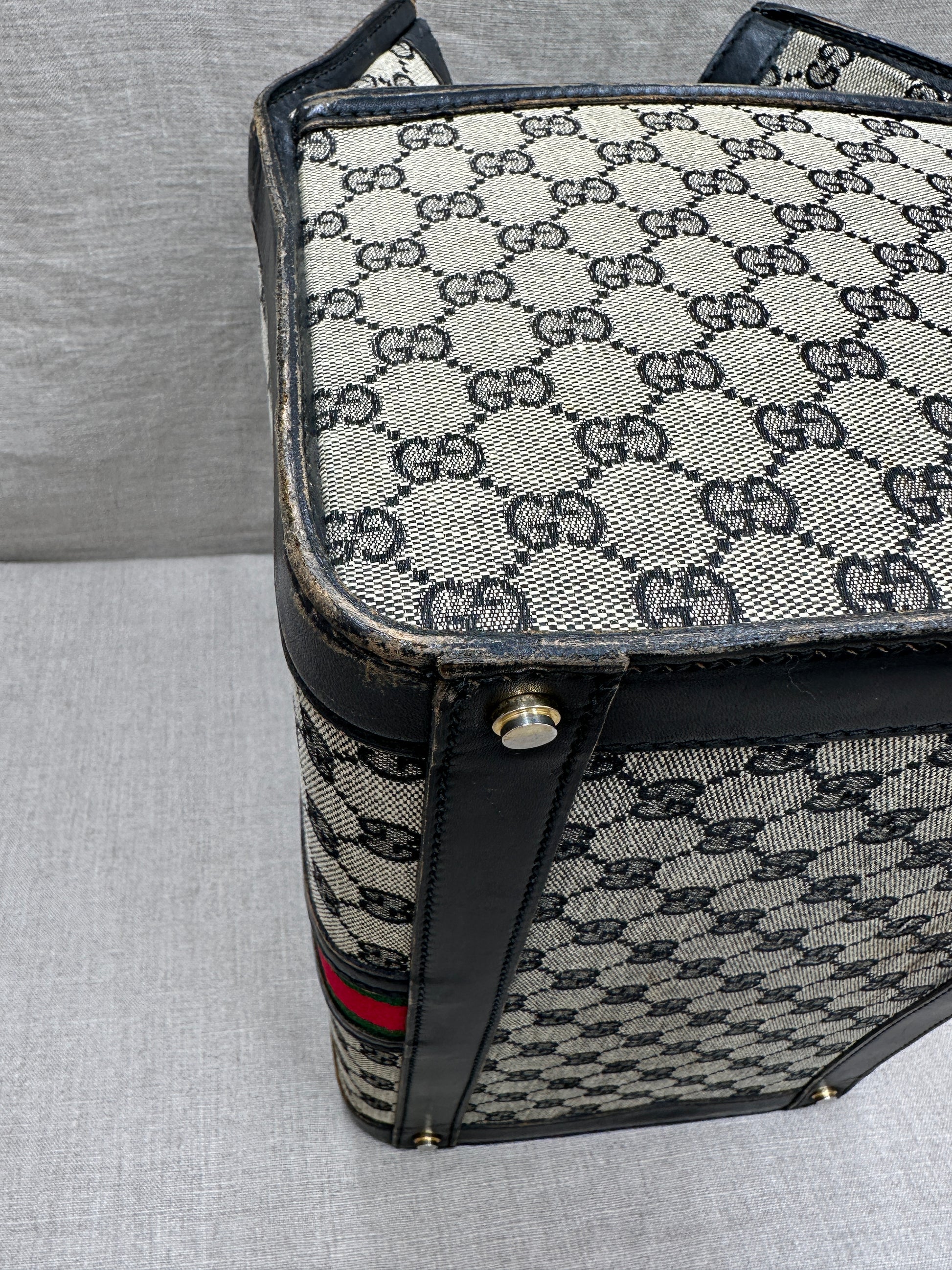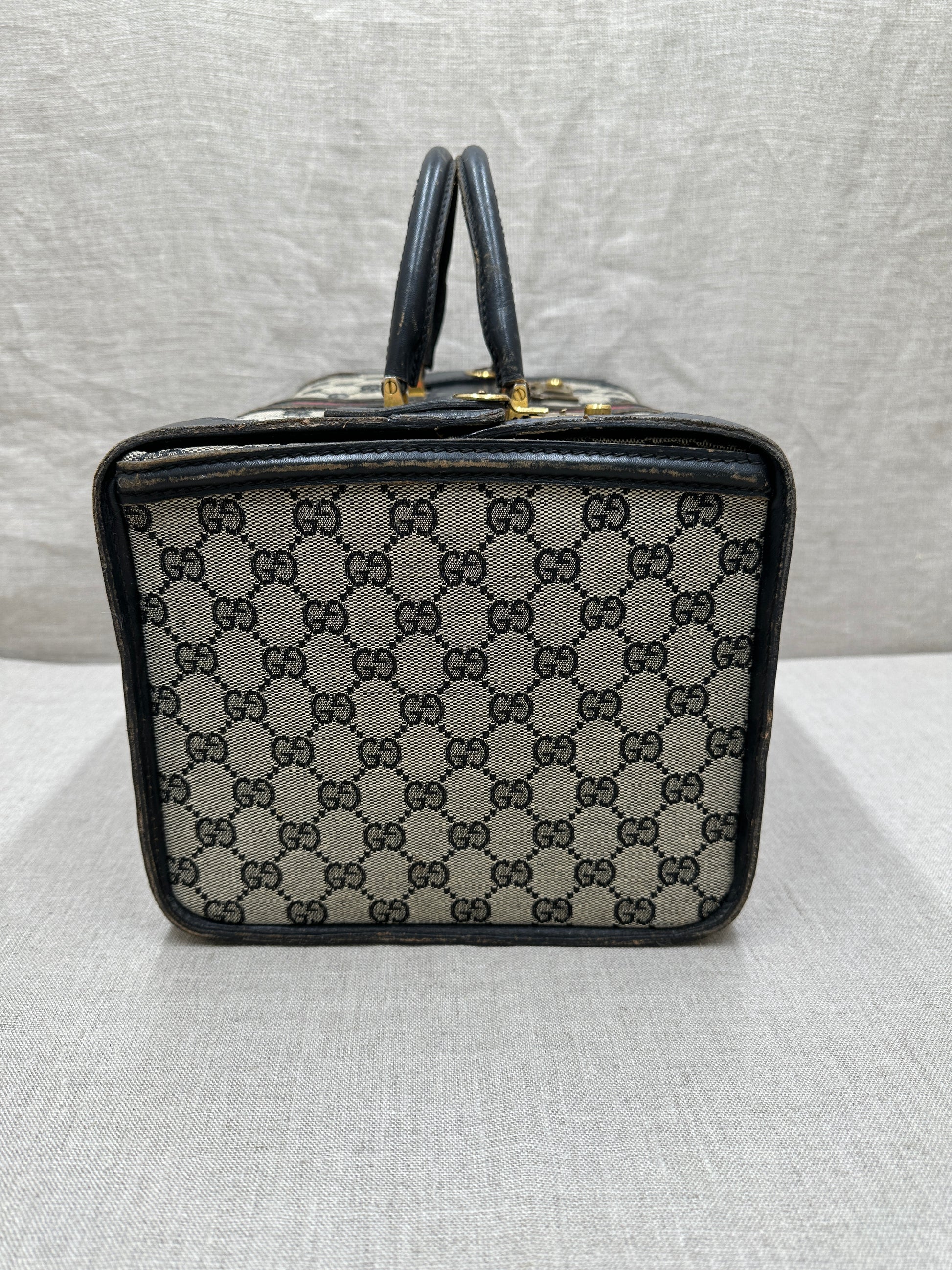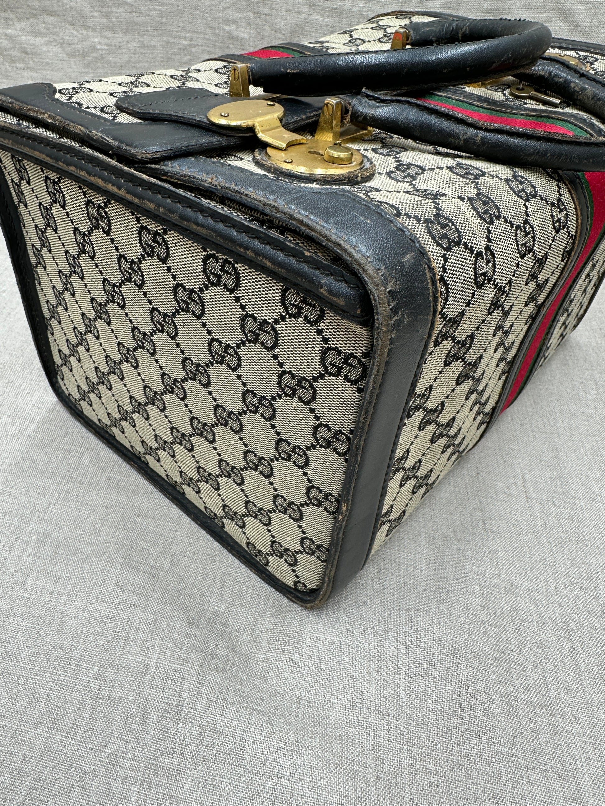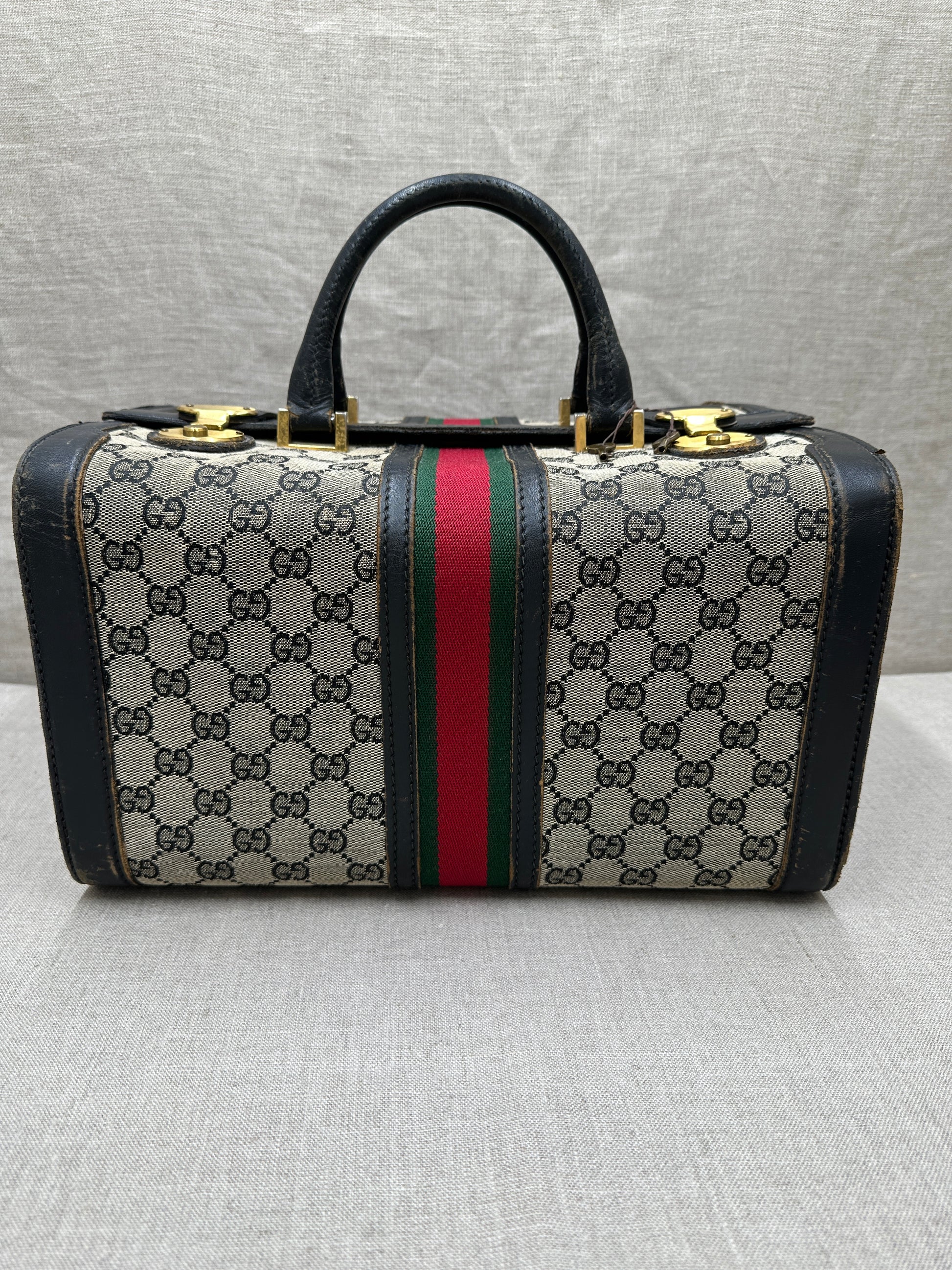 GG supreme canvas samt mörkblått skinn. Röd/grön revär. Guldfärgad metall detaljer.