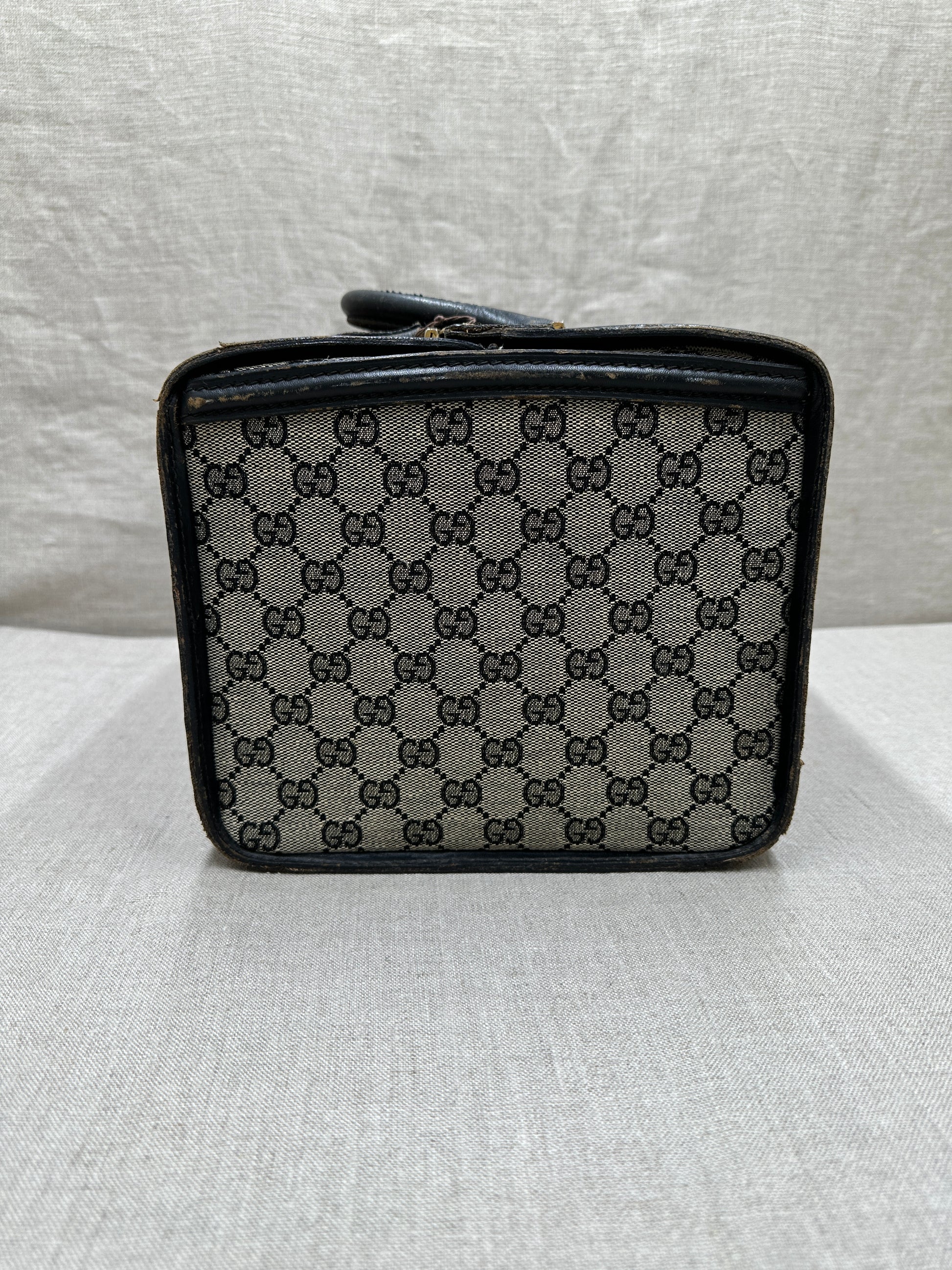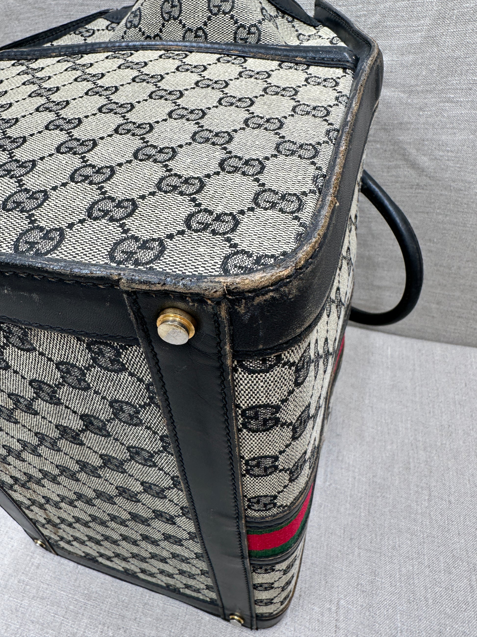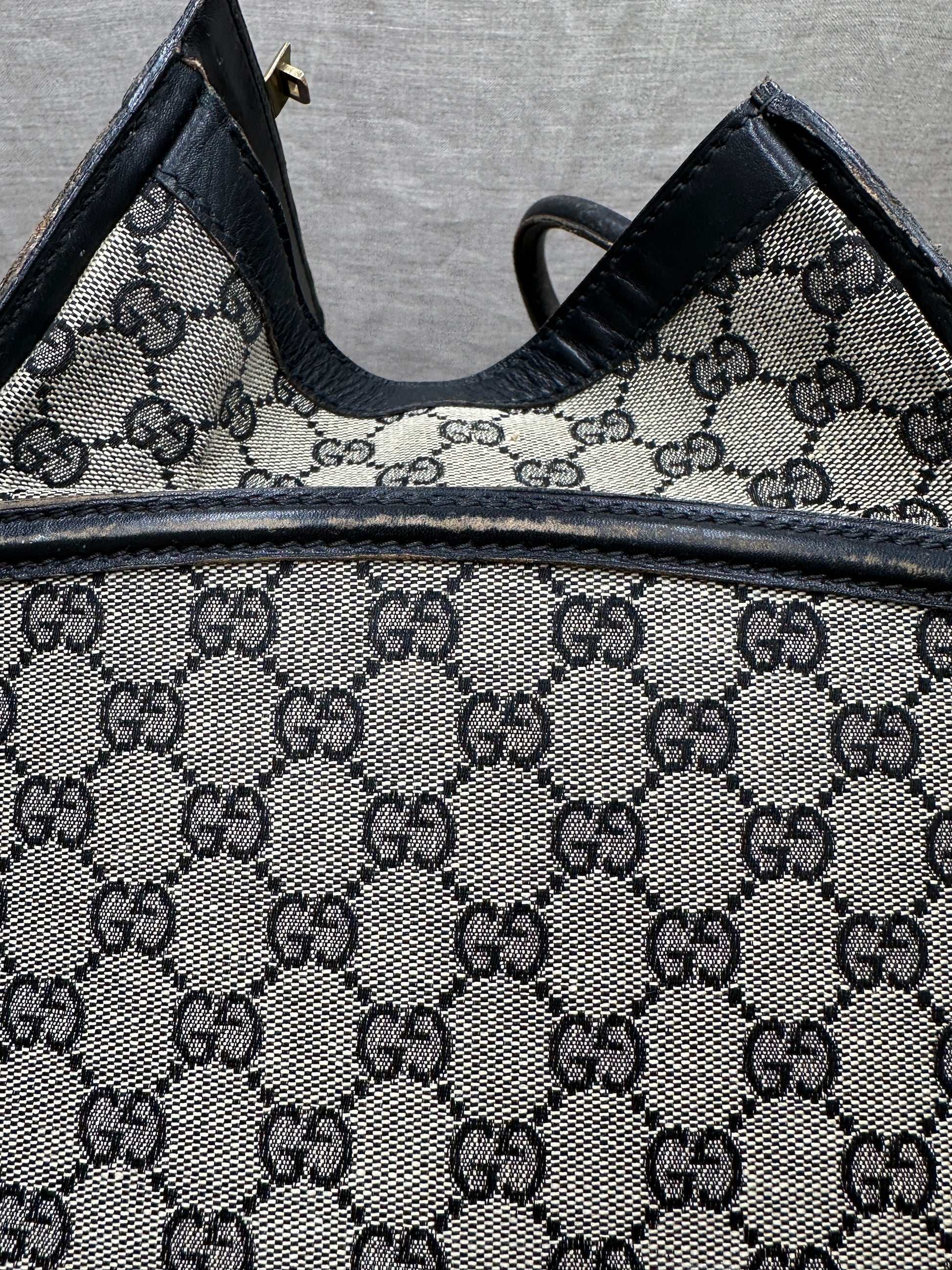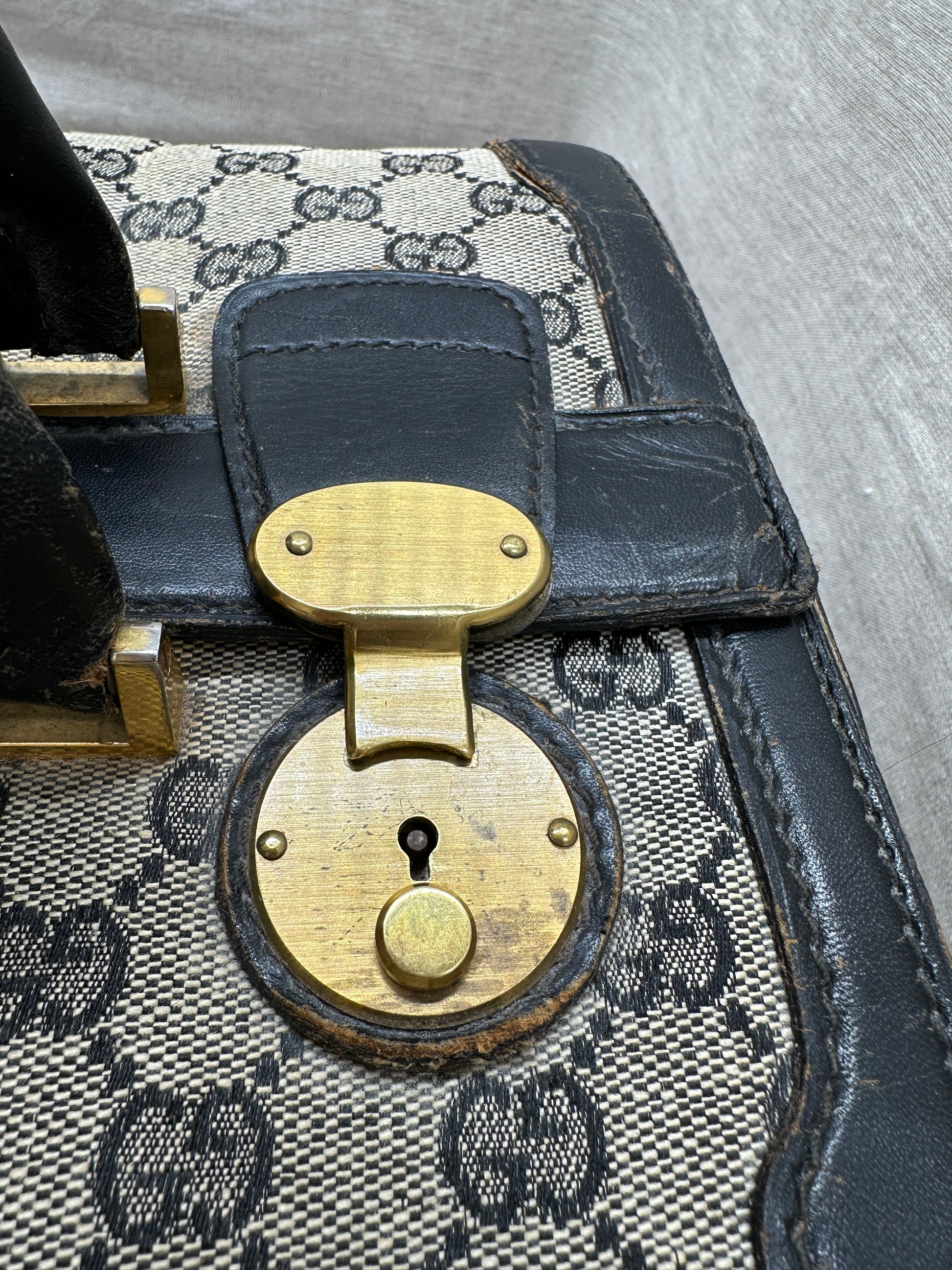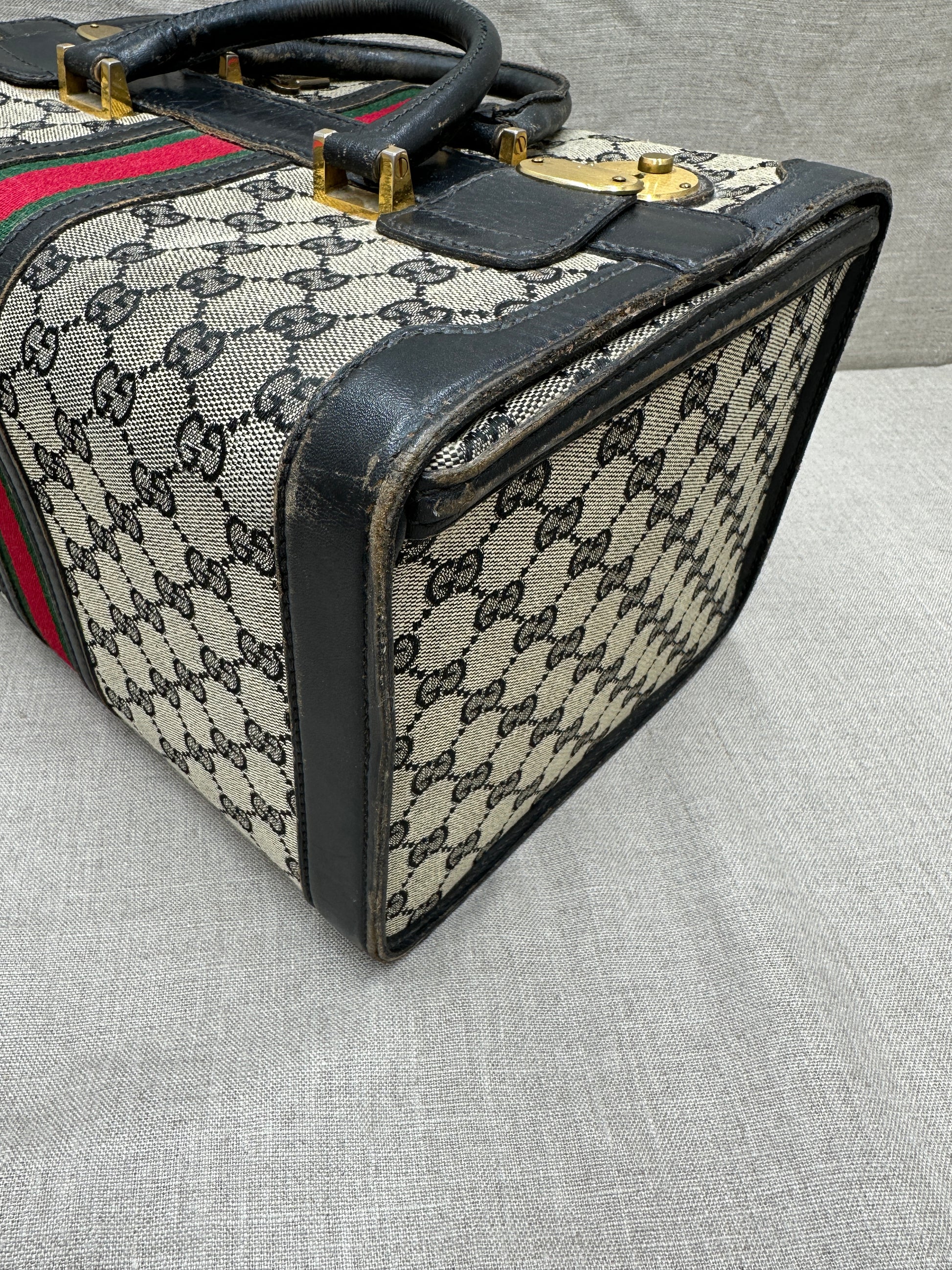 GG supreme canvas samt mörkblått skinn. Röd/grön revär. Guldfärgad metall detaljer.