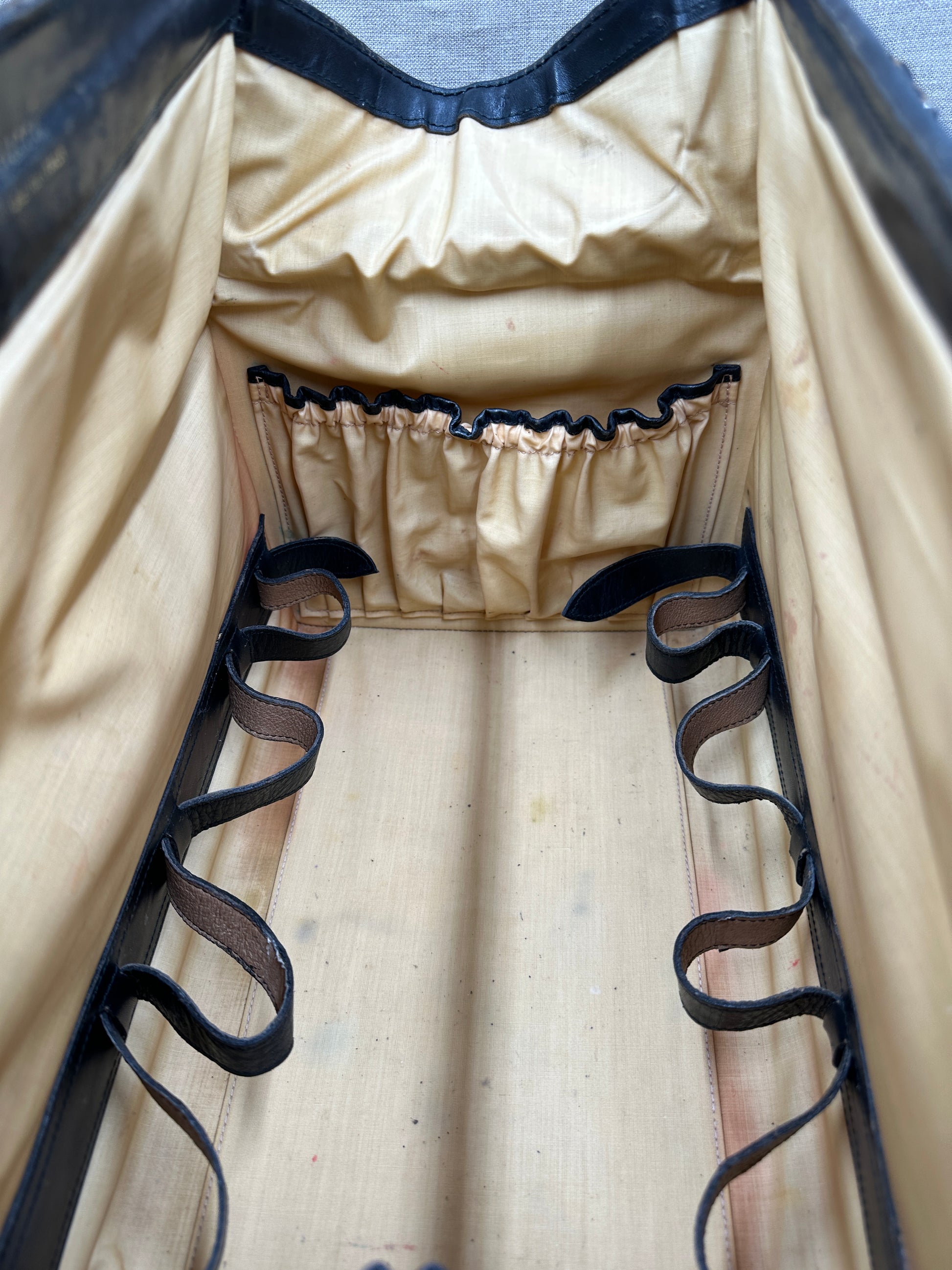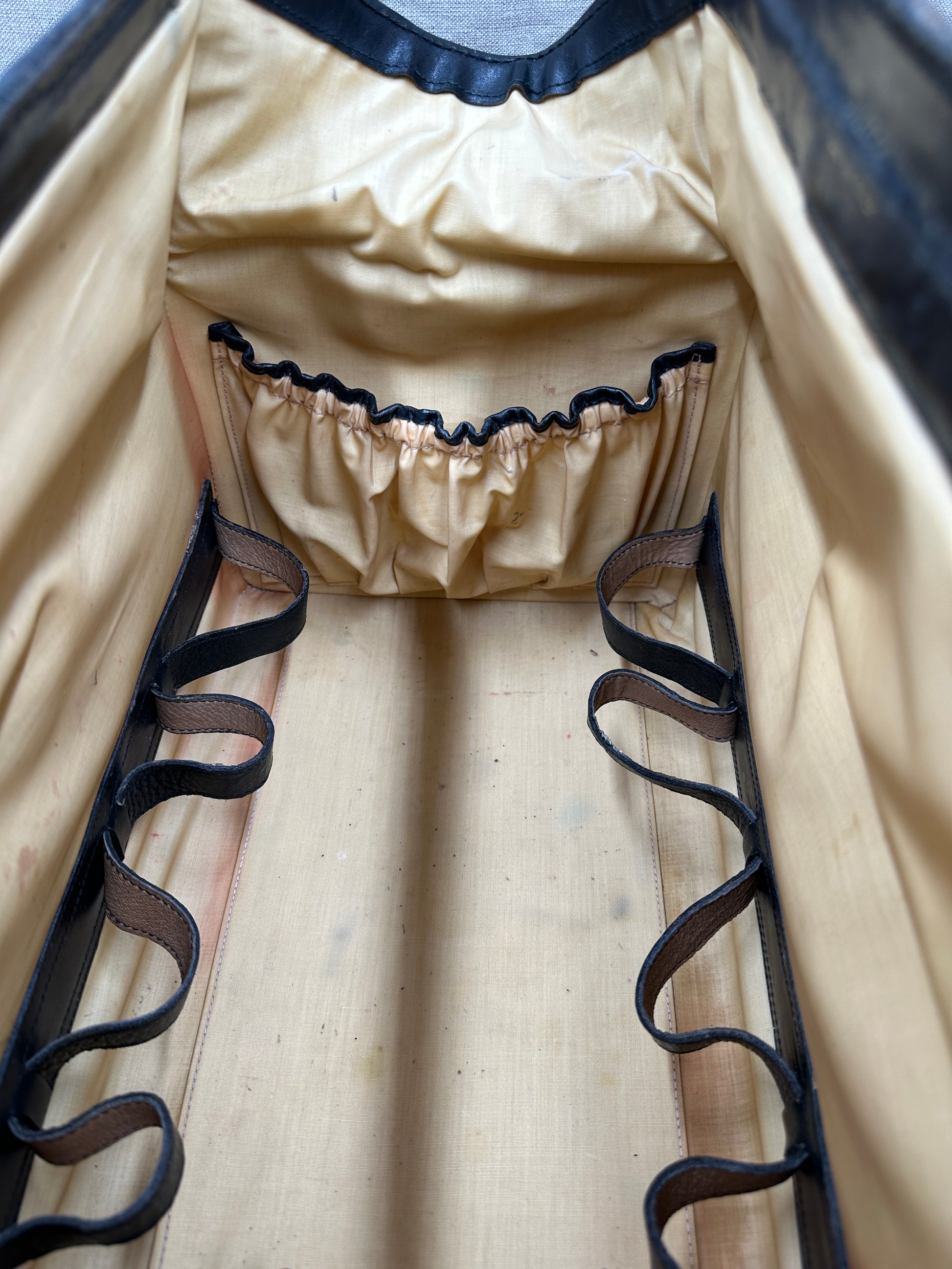 Fodrad i pvc. Två innerfack samt läderremmar.